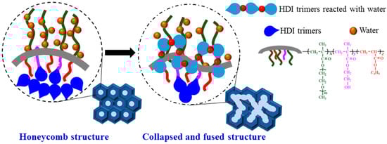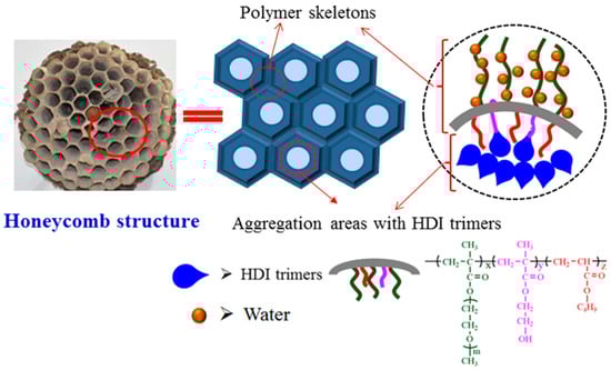The copolymer P(OEGMA-co-HEMA-co-BMA) prepared can be used as an emulsifier to emulsify HDI trimers, which can be defined as a reactive macro-emulsifier. The -OH in HEMA can be reacted with HDI trimers and the water is added dropwise to achieve a stable O/W emulsion. What’s more, freeze-drying technique and SEM is combined to examine the exact microstructures of emulsion. Seen from Figure 2, the emulsion exhibits honeycomb structures. The reason about formation of this kind of structure is that the reactive macro-emulsifier divides the emulsion into two stable phases. One is the outer water phase with extended OEGMA segment and the other is inner aggregation areas of HDI trimers and organic solvents. As freeze-drying technique is used to remove the water, the lightweight polymer skeleton is formed. Moreover, the process of freeze-drying also removes the HDI trimers and organic solvents, which is the reason for the formation of the cellular honeycomb structures. The schematic diagram of the honeycomb structure is depicted in Figure 3.