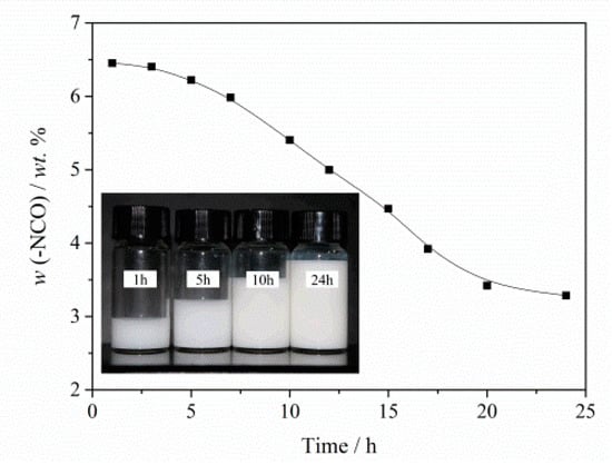 Detecting the -NCO content in the emulsions is a common method to investigate whether the emulsion undergoes deterioration. Seen from the digital photos in Figure 4, the appearance of emulsion does not change over time. However, the -NCO content is decreased obviously in the emulsion with the increase of storage time. It means that the emulsion has already loses its activity and becomes inactivated despite the unchanged appearance of the emulsion.