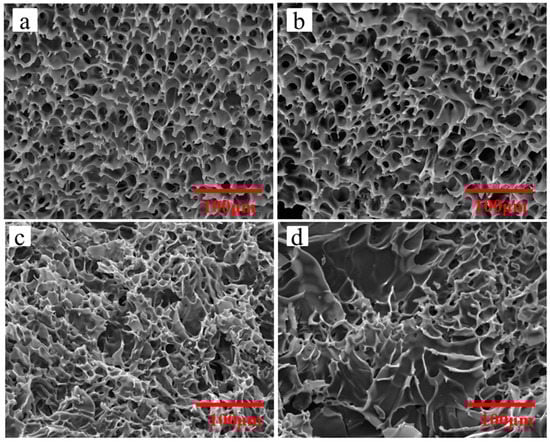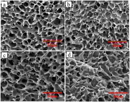 The NCO groups can be so reactive that they react with almost all polar substances, so knowing the precise isocyanate content is important in aiding our evaluating of the quality of the materials. The reference test for the determination of NCO content is based on the modification of isocyanate functional groups to urea using dibuthyl amine solution in toluene followed by the titration of the excess dibuthyl amine with standardized hydrochloric acid solution. Other titration methods, such as using dicyclohexyl amine as an alternative to dibuthyl amine, have been developed [7,8,9]. However, there are a number of limitations. These methods are used for samples containing high isocyanate content. On the other hand, a large amount of sample is required when analyzing high molecular weight samples. Another limitation is that accurate titration cannot be performed in all solvents. Alternative methods for titration of simple isocyanates, such as using liquid chromatography, have been developed [10], but in many cases isocyanate the content of polymeric isocyanate cannot be determined by this method. FT-IR, middle infrared spectroscopy (MIR), and near infrared spectroscopy (NIR) has also been successfully utilized to determine NCO content of adhesive urethane prepolymers [11,12]. These methods have disadvantages such as poor accuracy of integration of peaks in infrared spectroscopy. Functional group analysis of polymers by NMR and 19F NMR spectroscopy is also known. Hydroxyl, amine, and acid functional groups of polymers have been successfully determined by 19F NMR spectroscopy [13,14,15]. The above-mentioned determination methods only emphasize on knowing the precise isocyanate content. The fact remains that we do not yet know the microstructure evolution caused by changes in isocyanate content. Therefore, to better understand the microstructure evolution process of emulsion with isocyanate content changes, we used freeze-drying and scanning electron microscopy to examine the microstructures evolution of isocyanate emulsion in different contents.