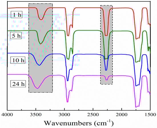 Based on the discovery for the changing micrograph of emulsions, the FT-IR spectroscopy in Figure 7 and data in Table 1 confirms these results. Carbamate (-NH) groups and isocyanate (-N=C=O) groups appear in near 3500 and 2250 cm−1, respectively. Due to the reaction of HDI trimers with water, there will be more -NH groups and less -N=C=O groups in the system. With the increase of standing time, the peaks of -NH groups become wider and their values of integral area increase. To the contrary, the peaks of -N=C=O groups become smaller and narrower, and their values of integral area decrease appaerently. At this time, we difine the ratio of -NH groups integral area to -N=C=O groups integral area as S(-NH):S(-N=C=O). Seen from Table 1, the value of S(-NH):S(-N=C=O) increases from 1.219 to 5.207 when the standing time of emulsion changes from 1 h to 24 h. All the FT-IR data confims that more and more -NCO groups are reacted with outside water to form carbamates macromolecules with the increase of standing time of emulsion, which coincides with explanation of collapsing and fused of honeycomb structures.