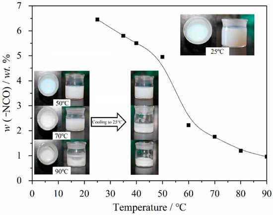 The temperature is also an important factor for deterioration of emulsions. We heated the emulsion to different temperature for 10 min and restore the -NCO content at room temperature. When the temperature is from room temperature to 50 °C, the appearances of emulsions present stable state (digital photos in Figure 8), and the -NCO content decrease slightly (Figure 8). However, when the temperature is above 50 °C, the -NCO content decrease dramatically. As shown in the digital photos in Figure 8, the appearances of emulsions show separated phases when the temperature reaches to 70 °C and 90 °C. However, their appearances change to viscous and stable phases when the temperatures are cooling to 25 °C. Therefore, it is impossible to judge the degree of emulsion deterioration from the appearance alone when emulsion suffers from short time heat.