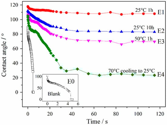 Compared with the blank sample, the contact angle of the emulsion significantly increased as shown in Figure 11. For example, the contact angle of a blank sample is quickly decreases from 92.5° (in 0.2 s) to 0° (in 4.8 s). When left at 25 °C for 1 h, the hydrophobic segments can form a hydrophobic film on the fiber surface and change the morphology of the fiber surface, so the sample shows excellent hydrophobicity. As the residence time and temperature of the emulsion increase, more and more -NCO groups react with external water to form urethane macromolecules, resulting in a decrease in the activity of the emulsion (compare with the SEM image of Figure 9). When the temperature rises to 70 °C and then drop to 25 °C, and the contact angle of the emulsion does not change. Since the reaction of -NCO groups with external water to form urethane macromolecules is an irreversible reaction, the emulsion after high temperature has been changed, so the contact angle does not increase after a significant decline.