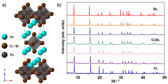 (a) n = 1 Ruddlesden–Popper (R–P) phase of Az2PbX4 (X = Cl, Br) showing alternating AzPbX3 perovskite and AzX rock salt layers along the c-axis, (b) PXRD data of mix-halide layered R–P phases: Az2PbClxBr4−x with composition 0 ≤ x ≤ 4 prepared by mechanosynthesis.