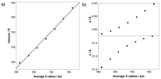 To study the mixed-halide solid solutions Az2PbClxBr4−x, the lattice parameters of each mechanosynthesised composition were determined by Rietveld refinement of PXRD data. The cell volume of these R–P phases varies linearly as a function of the average anion radius, Figure 3a (the average anion radius was calculated using rBr = 196 pm and rCl = 181 pm according to Shannon [22]). This linear variation is expected in accordance with Vegard’s law. The lattice parameters a and c, on the other hand, show a nonlinear relationship with the average anion radius (Figure 3b), which suggests anisotropic expansion/contraction along the a- and c-axis. The larger expansion in a is consistent with the increased X anion radius which affords a larger void for the Az+ cation, resulting in less required expansion in the interlayer spacing. Based on the analysis using Mn2+ as a proxy for Az+ we have no information regarding any orientation or dynamics of the Az+ cation.
