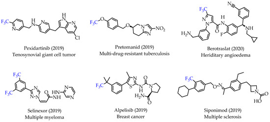 Trifluoromethyl (CF3) groups are important functional groups in pharmaceutical and medicinal chemistry as excellent bioisosteres of methyl groups. CF3 groups are incorporated into drugs to improve potency, binding selectivity, lipophilicity and facilitate their administration [1,2]. Improved pharmacological activities and properties are observed with numerous CF3 group-containing drugs. This trend is also visible in recent FDA approvals for drugs containing a CF3 group (Figure 1) [3].