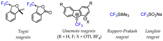 Examples of common trifluoromethylating reagents.