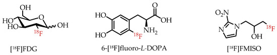 Fluorine-18 (18F) is among the most commonly used radioisotopes for PET, as demonstrated by hundreds of fluorine-18-labelled radiotracers [16,17]. Prominent examples of clinically used PET radiotracers are depicted in Figure 3. The most widely and frequently used PET radiotracer by far is glucose analogue 2-[18F]fluoro-2-deoxy-D-glucose ([18F]FDG). [18F]FDG is particularly useful in measuring enhanced glucose metabolism due to altered energy metabolism, also referred to as the Warburg effect, in many cancers [20]. 1H-1-(3-[18F]Fluoro-2-hydroxypropyl)-2-nitroimidazole ([18F]FMISO) is another example of a fluorine-18-labelled radiotracer used in the clinic for the visualization of tissue or organ hypoxia in cancer and other diseases [21]. The importance of 18F-labeled radiotracers for clinical PET was recently demonstrated by the FDA approval of fluorine-18-labelled amino acid [18F]Fdopa for clinical PET imaging of Parkinson’s disease [3].