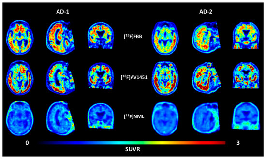 Transversal, sagittal, and coronal view of averaged PET images of [18F]AV1451 and [18F]NML uptake in two AD patients 90–110, 80–100, and 60–90 min p.i., respectively. (Images taken from reference [45]).
