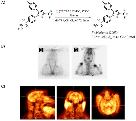 (A) Radiolabelling of celecoxib reported by Prabhakaran et al., (B) microPET images of [18F] celecoxib in a rat. PET images of [18F] celecoxib in a rat (images are normalized to the injected dose). (1) Sum of 0–20 min PET images; (2) sum of 60–120 min PET images (C) Sum of the (0–120 min) PET images of a baboon brain after the injection of 44 MBq of [18F]Celecoxib. First column, sagittal; middle column, coronal; last column, axial views. (Adopted from [23]; RCY: radiochemical yield; Am: molar activity).
