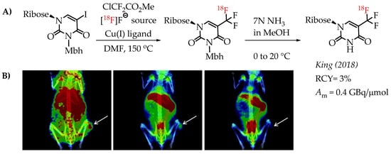 (A) Radiolabelling of trifluridine by King et al. (B) Representative PET/CT images selected from a 90 min dynamic PET scan of a mouse bearing an HCT116-derived tumour, following the administration of [18F]trifluridine. The white arrows indicate the tumour (adopted from [61]; RCY: radiochemical yield; Am: molar activity).