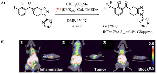 Fu et al. reported a [18F]trifluoromethylation reaction for the synthesis of [18F]PTTP, a radiotracer that targets purinergic receptor P2X7 (P2X7R). P2X7R is an emerging molecular target for tracking and visualizing inflammation [62].