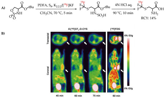 (A) [18F]Trifluoromethyl cysteine synthesis from cyclic sulfamidates. (B) Static PET images of C6 glioma-bearing mice scanned at 45, 60 and 75 min after injection of S-[18F]CF3 D CYS and 60 min after injection of [18F]FDG (the white arrow indicates the tumour); (adopted from [67]; (RCY: radiochemical yield).