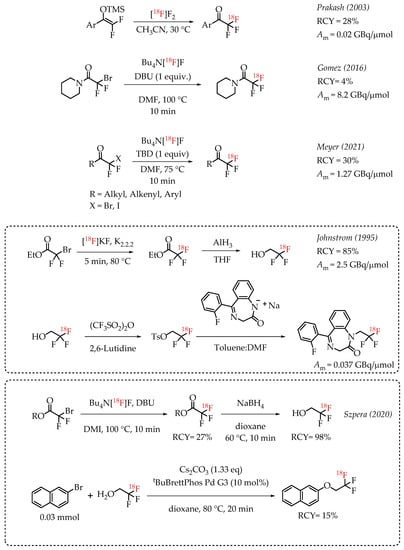 Prakash et al. demonstrated the radiolabelling of protected enols as a strategy for synthesizing [18F]CF3 groups. However, the method was limited to the synthesis of [18F]trifluoroacetoaryl ketones [38]. The strategy utilized electrophilic radiofluorination with [18F]F2 resulting in products with diminished molar activity in the range of 0.02 GBq/μmol. Gomez et al. reported a method for the synthesis of fluorine-18-labelled trifluoroacetamides [39]. The direct nucleophilic displacement of difluorobromides with [18F]fluoride was not efficient. The addition of metal salts was also not successful, whereas the addition of base DBU proved to be crucial, and radiochemical conversion yields of 71% were observed. Further exploration of other nitrogen-based nucleophilic activators such as DBU confirmed the beneficial effects of nitrogen bases. The use of guanidine derivatives TBD and MTBD further improved the radiochemical conversions to 81% and 76%, respectively. The authors reported a moderate molar activity of 8.4 GBq/μmol for the reaction. Meyer and co-workers reported a nucleophilic halex reaction to synthesize α-CF3 ketones [40]. The reaction used TBD (1,5,7-triazabicyclo-[4.4.0]dec-5-ene) as additive. They were able to obtain a 30% yield and a molar activity up to 1.27 GBq/μmol.
