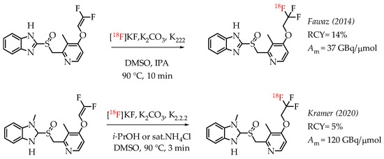 Fawaz et al. reported the synthesis of [18F]lanzoprazole ([18F]LNS) and its subsequent analysis as a potential radiotracer for quantifying aggregated tau protein levels in Alzheimer’s disease (AD) and progressive supramolecular palsy (PSP) [44]. The authors followed the nucleophilic addition chemistry route of n.c.a. [18F]fluoride on a difluoromethylidene to generate the [18F]CF3 group (Scheme 4). They observed the formation of a [18F]difluoromethylidene compound as the primary side product during the reaction. The combined radiochemical yield was 14%, including the side product. Further optimization did not improve the radiochemical yield. Moreover, the authors found that the ratio of [18F]difluoromethylidene increased, and the radiochemical yield of [18F]LNS was not higher than 7%.