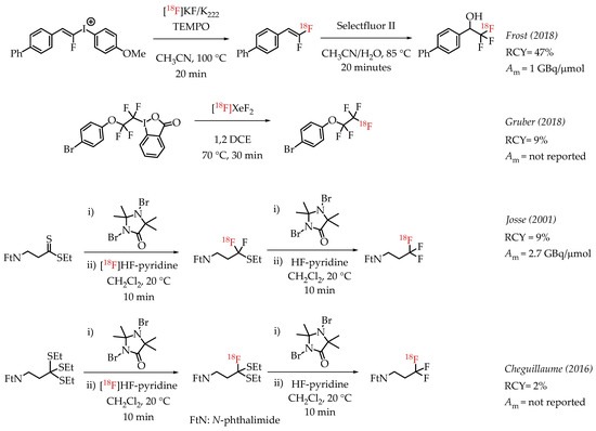 Additional examples of aliphatic [18F]CF3 compounds are summarized in Scheme 5. Frost et al. described the synthesis of 1,1-[18F]difluoroalkenes from the reaction of [18F]fluoride and fluoroalkenyl(4-methoxyphenyl)iodonium triflates [46]. The nucleophilic substitution on the iodonium salt generated the respective fluorine-18-labelled difluoroalkene, and subsequent fluorination of the alkene with Selectfluor II yielded the [18F]CF3 group.