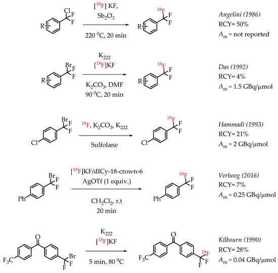 Angelini et al. attempted the synthesis of [18F]CF3 groups by a Lewis acid-mediated dechlororadiofluorination using [18F]fluoride and Sb2O3 [50]. This study resulted in the generation of [18F]CF3 groups at low molar activities and moderate radiochemical yields. Das et al. utilized the high reactivity of the benzylic position in various bromo-difluoromethyl aryl compounds for nucleophilic substitution reactions with n.c.a. [18F]fluoride. The resulting [18F]CF3-containing compounds were obtained in low radiochemical yields of 2–4% at a low molar activity (1.5 GBq/μmol) [51]. Authors observed an inverse correlation between the obtained molar activity and the reaction temperature. Verhoog et al. discussed a [18F]trifluoromethylation reaction via Ag(I)-mediated halogen exchange with aryl difluorobromides [52]. The reaction can be performed at room temperature at radiochemical yields of 7% and molar activities of 0.25 GBq/μmol. Kilbourn et al. reported the synthesis of aryl [18F]CF3 groups with a molar activity of 0.04 GBq/μmol. The examples of these halex reactions are summarized in Scheme 6.