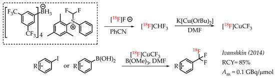 Ivashkin et al. described a novel approach for the generation of [18F]CF3 groups (Scheme 9). The authors used [18F]fluoroform which was prepared from a difluormethylsulfonium salt [57]. [18F]fluoroform was converted into organometallic reagent [18F]CuCF3 using K[Cu(OtBu)2], which in turn facilitates the cross-coupling reaction with aryl iodides or aryl boronic acids.