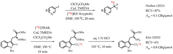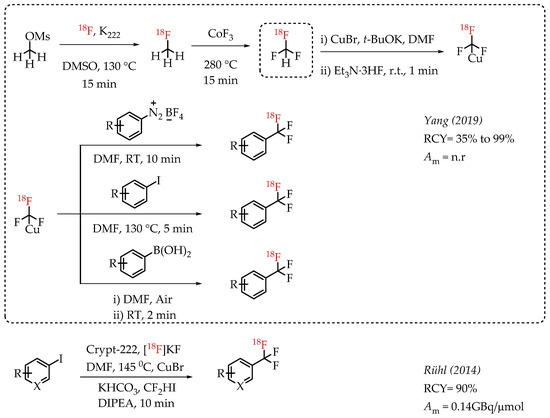 Rühl et al. utilized difluoroiodomethane as the difluorocarbene precursor. As a gas, difluoroiodomethane posed some inherent operational challenges. This chemistry converts CF2HI in the presence of CuBr into Cu-CF3 to improve the handling. In the presence of DIPEA and n.c.a. [18F]fluoride, reaction of Cu-CF3 with various iodoarenes afforded respective [18F]CF3-substituted aromatic compounds [59]. The chemistry reduces the dependence on strong bases to deprotonate CF2HI.