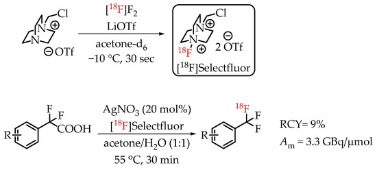 In 2013, Mizuta et al. published an Ag-catalysed decarboxylative radiofluorination with [18F]Selectfluor (Scheme 13) [31]. Electrophilic radiofluorinations using Selectfluor are stable towards water without the risk of inactivation. This carrier-added radiofluorination process yielded the target compounds in radiochemical yields greater than 95% and molar activities of 3.3 GBq/μmol.