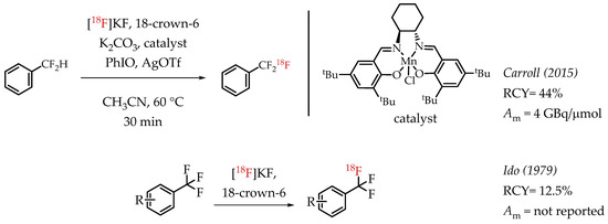 Carroll et al. described an Mn-salen catalysed benzylic C-H activation for the radiofluorination of benzylic difluoromethanes [63]. The process uses a commercially available Jacobsen-type precatalyst and iodosobenzene as a stoichiometric oxidant. The authors reported good radiochemical yields and a molar activity in the range of 4 GBq/μmol. Among the earliest reports on the synthesis of [18F]CF3 compounds, Ido et al. demonstrated a fluorine isotopic exchange reaction to synthesize [18F]CF3 groups (Scheme 14) [22,64].