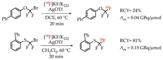 [18F]Trifluoromethylation reactions with thiophenols and phenols were reported by Khotavivattana et al. [65]. The reaction proceeded via nucleophilic substitution with n.c.a. [18F]fluoride on bromodifluoromethylphenylsulfide and bromodifluoromethoxybenzene, respectively. The reaction required highly active AgOTf. The authors reported a significant reduction in the reactivity of AgOTf that was stored at room temperature and performed the addition of AgOTf inside a glovebox. The process yielded [18F]trifluoromethylated arenes with low molar activities in the range of 0.5 GBq/μmol (Scheme 16).