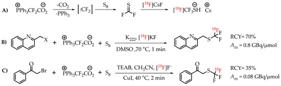 Liang et al. discussed an elegant synthesis route to access [18F]CF3-S groups employing novel reagent difluoromethylene phosphobetaine (PDFA) [27]. The described method opened the path for trifluoromethylthiolation reactions starting from several commercially available alkyl halides (Scheme 17).