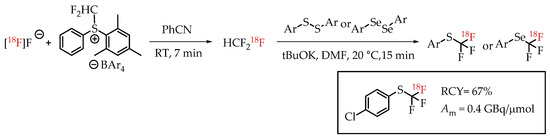 Jubault et al. reported a method for [18F]trifluoromethylthiolation and [18F]trifluoromethyl-selenation reactions via [18F]fluoroform (Scheme 18) [68]. [18F]fluoroform was generated by a procedure from the same group [57]. [18F]fluoroform was trapped by an aromatic disulfide (or diselenide) and a base. This reaction provided the corresponding [18F]trifluoromethyl-sulfur/selenium compounds in low molar activity of 0.38 GBq/μmol.