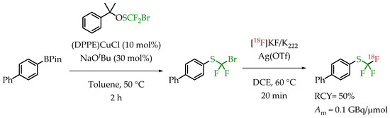 A novel reagent for bromodifluoromethylthiolation reactions was reported by Wu et al. [69]. α-Cumyl bromodifluoro-methanesulfenate was used for transferring a bromodifluoromethylthio group onto an aryl boronic ester (Scheme 19). Subsequent radiofluorination with n.c.a. [18F]fluoride in the presence of AgOTf gave compounds containing a [18F]CF3-S group in good radiochemical yields but a low molar activity in the range of 0.1 GBq/μmol.