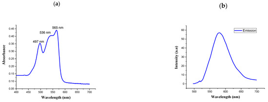 UV-vis spectra and fluorescence spectra were measured to characterize the spectral properties of R-PE. As shown in Figure 2a,b, the absorption spectra of the purified phycoerythrin were determined by UV-visible spectrophotometry at 200–800 nm. The absorption spectra had three peaks: two at 497 and 536 nm and a main peak at 565 nm. The highest peak was measured by fluorescence spectrophotometry. The spectral profile is commonly used to indicate the non-degradation of phycoerythrin [31]. It presented a typical absorption spectrum of R-PE. Similarly, the UV-visible absorption spectrum of the R-phycoerythrin obtained from B. atropurpurea showed a peak at 530–570 nm, indicating the presence of R-phycoerythrin [32].