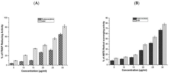 The antioxidant activity of the purified phycoerythrin was analyzed using ABTS and FRAP assays and is presented in Figure 5A,B. The antioxidant activity of R-phycoerythrin alpha subunit increased in a dose-dependent manner, which was compared with GSH (glutathione).