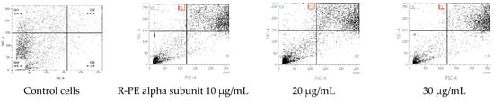 Apoptotic cells were identified with a dual staining method. HepG2 cells (1 × 106/well) were cultured in 6-well plates and incubated for 24 h. After incubation, the medium was removed and replaced with a medium containing the IC50 concentration of R-phycoerythrin alpha subunit-untreated control cells as a negative control. After 24 h, the cells were washed three times with phosphate-buffered saline and harvested by spreading 1 mL of trypsin over the surface of the tissue culture flask and incubated for 3–5 min. Following incubation, the detached cells were rinsed with medium, transferred to a centrifuge tube, and centrifuged at 1000 rpm for 5 min. The supernatant was discarded, and the pellet was resuspended in 500 µL of 1× binding buffer. The cells were stained with 5 µL of annexin V-FITC conjugate and 10 µL of propidium iodide (PI) solution in the dark at 30 °C for 15 min, and then analyzed by flow cytometry (CytoFLEX, Beckman Coulter, Indianapolis, IN, USA) [52].