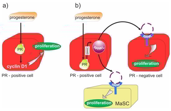- Gonzalez-Suarez, E.; Jacob, A.P.; Jones, J.; Miller, R.; Roudier-Meyer, M.P.; Erwert, R.; Pinkas, J.; Branstetter, D.G.; Dougall, W.C. RANK ligand mediates progestin-induced mammary epithelial proliferation and carcinogenesis. Nat. Cell Biol. 2010, 468, 103–107. [Google Scholar] [CrossRef] [PubMed]