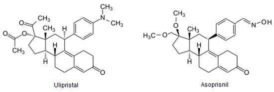 - Chwalisz, K.; Perez, M.C.; DeManno, D.; Winkel, C.; Schubert, G.; Elger, W. Selective Progesterone Receptor Modulator Development and Use in the Treatment of Leiomyomata and Endometriosis. Endocr. Rev. 2005, 26, 423–438. [Google Scholar] [CrossRef]