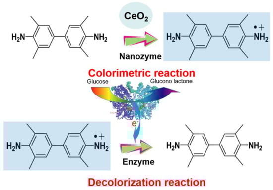 Schematic illustration for the CeO2-based catalyzed oxidation of TMB to yield blue oxTMB product and GOx-based decolorization.