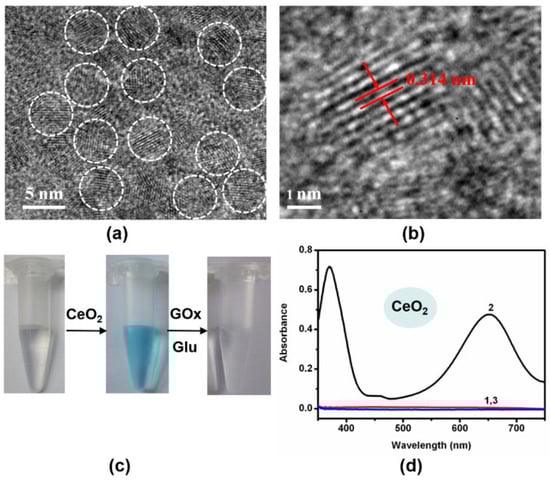(a,b) TEM images of as-synthesized CeO2 NPs. (c) Typical photographs of TMB reaction solutions oxidized by CeO2 NPs and oxTMB reaction solutions reduced by GOx/glucose. (d) UV-vis absorption spectra of TMB reaction solutions in the presence of (1) no reactants, (2) CeO2 NPs, (3) CeO2 NPs, glucose, and GOx. ([TMB] = 120 μM, [CeO2 NPs] = 6 μg/mL, [glucose] = 5 mM, [GOx] = 1 unit/mL, [citrate buffer] = 40 mM, pH 6.0).