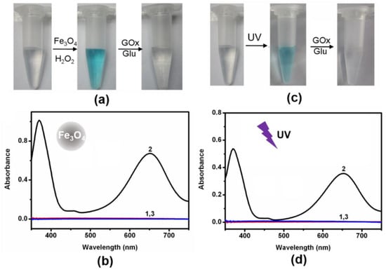 (a) Typical photographs of TMB reaction solutions oxidized by Fe3O4/H2O2 and oxTMB reaction solutions reduced by GOx/glucose. (b) UV-vis absorption spectra of TMB reaction solutions in the presence of (1) no reactants; (2) Fe3O4 NPs and H2O2; (3) Fe3O4 NPs, H2O2, glucose, and GOx. (c) Typical photographs of TMB reaction solutions treated by UV-light and oxTMB reaction solutions reduced by GOx/glucose. (d) UV-vis absorption spectra of TMB reaction solutions in the presence of (1) no reactants; (2) UV-light; and (3) UV-light, glucose, and GOx. ([TMB] = 200 μM, [Fe3O4 NPs] = 20 μg/mL, [H2O2] = 10 mM, [glucose] = 5 mM, [GOx] = 1 unit/mL, [citrate buffer] = 40 mM, pH 6.0).
