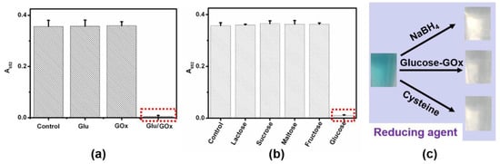 (a) Absorbance intensity at 652 nm of TMB reaction solutions in the presence of (from left to right): no reactants, glucose, GOx, glucose/GOx. (b) Absorbance intensity at 652 nm of TMB/GOx reaction solutions in the presence of (from left to right): no reactants, lactose, sucrose, maltose, fructose, and glucose. (c) Typical photographs of oxTMB reaction solutions reacting with NaBH4, glucose/GOx, and cysteine, respectively. ([TMB] = 120 μM, [CeO2 NPs] = 4 μg/mL, [glucose] = 5 mM, [GOx] = 1 unit/mL, [citrate buffer] = 40 mM, pH 6.0).