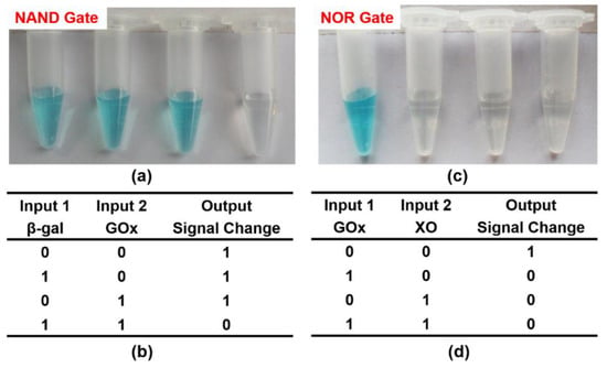 Analogously, an NOR logic gate was constructed that used GOx and XO as inputs and an intense blue solution as the output signal (Figure 5). The starting solutions containing glucose, xanthine, CeO2 NPs, TMB, and oxygen in citrate buffer (pH 6.0) were first added to four tubes. Then, input-1 (GOx) and input-2 (XO) were added according to their corresponding states for each logic operation (0/0, 1/0, 0/1, 1/1). FADH2 can be generated in two parallel catalytic reactions, thus achieving the NOR logic gate. In the absence of any input, the logic operation produced a visual signal (oxTMB with blue color) that is recognized by the naked eye (input = 1). For another, FADH2 was generated when either or both inputs were added. As a result, the formation of oxTMB could be effectively prevented due to the reduction properties of FADH2, and the mixture became colorless (output = 0) (Figure 6c,d). This response from the solution corresponds to the NOR logic gate.