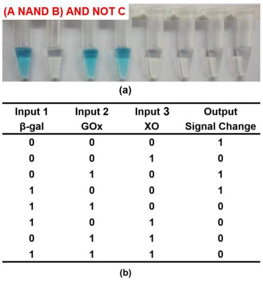 Except for the simple logic circuit, the multi-enzyme-based complex system was also explored. Based on the above NAND and NOR gates, we further demonstrated the operation of a Boolean logic system to calculate (A NAND B) AND NOT C by employing three enzyme inputs (β-gal, GOx, and XO). The starting solutions contained lactose, xanthine, oxygen, TMB, and CeO2 NPs in citrate buffer (pH 6.0). FADH2 could be generated when both β-gal and GOx co-existed. Specifically, the reaction process was as follows: β-gal could firstly hydrolyze lactose to generate galactose and glucose. GOx presented glucose-oxidase activity, through which the intermediated state of GOx(FADH2) could be produced during the oxidation of glucose. In addition, FADH2 could also be produced by introducing XO, since xanthine could be catalyzed by XO to generate FADH2. As a result, the formation of oxTMB could be effectively prevented due to the reduction properties of FADH2, and the system displayed a color change from blue to colorless (output = 0). As shown in Figure 7, when input 1 and input 2 did not exist together or input 3 was absent, FADH2 could not be produced to prevent the formation of oxTMB (output = 1). This result correlated well with the (A NAND B) AND NOT C logic gate.