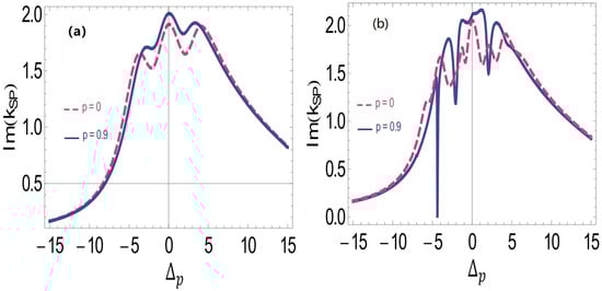 SPP absorption spectrum at the interface with SGC effect vs , such that (a) = 1 MHz, , , , , , , , , and , , and atoms/cm; (b) = 1 MHz, , , , , , , , , , , , , and atoms/cm.