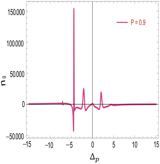 Group index of SPP versus with Doppler broadening and SGC Effect, such that = 1 MHz, , , , , , , , , , p = 0, , and atoms/cm.