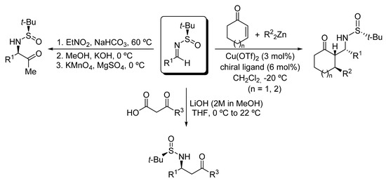 - González-Gómez, J.C.; Foubelo, F.; Yus, M. Tandem enantioselective conjugate addition-Mannich reactions: Efficient multicomponent assembly of dialkylzincs, cyclic enones and chiral N-sulfinimines. Tetrahedron Lett. 2008, 49, 2343–2347. [Google Scholar] [CrossRef]