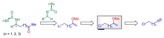 Continuing our interest in the stereoselective synthesis of amino ketone derivatives from chiral N-tert-butanesulfinyl imines, and being aware of the potential interest as synthetic intermediates of these compounds, we decide to explore a new synthetic pathway to access to γ-, δ- and ε-amino ketone derivatives in an enantioenriched form, by performing a diastereoselective addition of a functionalized organolithium compound to these imines. Functionalized organolithium compounds are valuable reagents, because upon reaction with electrophiles, polyfunctionalized molecules are directly produced [23,24]. These organolithium compounds can be prepared from appropriate precursors following classical procedures, the most commonly used are halogen-lithium exchange [25]. Our retrosynthetic analysis for the preparation of these amino ketone derivatives is depicted on Scheme 2, involving lithiation of the corresponding chloroenol ether, which could be prepared from the corresponding chloroalkyne, subsequent reaction with the imine, and final hydrolysis.