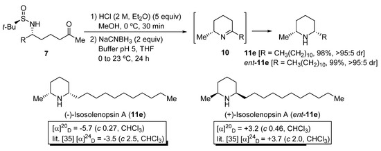To demonstrate the synthetic utility of N-tert-butanesulfinyl δ-amino ketone derivatives 7, the stereoselective preparation of piperidine ring systems was accomplished in two steps. This methodology consists in an initial desulfinylation under acidic conditions, and a subsequent reduction of the resulting imine intermediate 10 with NaCNBH3 [31,32]. As a result, 2,6-cis-disubstituted piperidines 11 were isolated in good to excellent yields (Scheme 4). The cis:trans diastereomeric ratio of compounds 11 was excellent in all cases, as determined by GC-MS analysis. It was not possible to determine by HPLC, or GC using chromatographic columns with a chiral packing, the enantiomeric purities of compounds 11e and ent-11e, but we consider that these values should be similar to the diastereomeric ratios of their precursors aminoketone derivatives 7e (>95:5 dr after column chromatography purification). Piperidines 11e and ent-11e [33] are, respectively, the alkaloids (−)-isosolenopsin A and (+)-isosolenopsin A, that have been isolated from the venom of the fire ants of the genus Solenopsis and display cytotoxic, antibacterial, insecticidal and antifungal activity (Scheme 4) [34,35]. It is worth noting that, by comparison of the optical rotation values of these natural products with those reported in the literature, we were able to confirm that the attack of the organolithium compound 4b occurred through the Re-face of chiral sulfinyl imine 5e, to give N-tert-butanesulfinyl δ-amino ketone derivative 7e as the major diastereoisomer, with S configuration at the stereocenter that is formed after this addition, as in piperidine 11e. The opposite configuration of piperidine ent-11e can be explained then by a selective attack of compound 4b through the Si-face of the (SS)-tert-butanesulfinyl imine ent-5e, which is the precursor in this case.