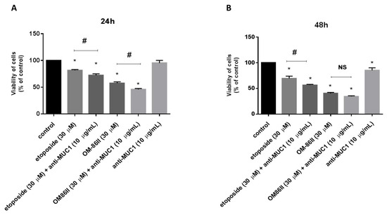 The effect of anti-MUC1 (10 μg/mL), OM-86II (30 μM), OM-86II + anti-MUC1 (30 μM + 10 μg/mL), etoposide (30 μM) and etoposide + anti-MUC1 (30 μM + 10 μg/mL) on the viability of AGS gastric cancer cells after 24 h (A) and 48 h (B) of incubation. Mean ± SD from three independent experiments (n = 3), performed in duplicate, are presented. * p < 0.05 vs. control group; # p < 0.05. MUC1, mucin-1; OM-86II, octahydropyrazin[2,1-a:5,4-a′]diisoquinoline derivative; NS, not significant.