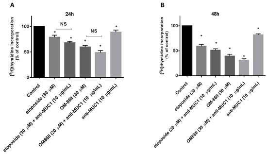 The effect of anti-MUC1 (10 μg/mL), OM-86II (30 μM), OM-86II + anti-MUC1 (30 μM + 10 μg/mL), etoposide (30 μM) and etoposide + anti-MUC1 (30 μM + 10 μg/mL) on DNA biosynthesis in cultured AGS cells after 24 h (A) and 48 h (B) of incubation, as measured by inhibition of [3H]-thymidine incorporation into DNA. Mean ± SD from three independent experiments (n = 3), performed in duplicate, are presented. * p < 0.05 vs. control group; MUC1, mucin-1; OM-86II, octahydropyrazin[2,1-a:5,4-a′]diisoquinoline derivative; NS, not significant.