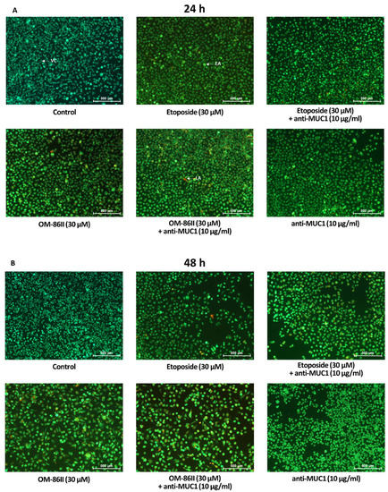 The influence of anti-MUC1 (10 μg/mL), OM-86II (30 μM), OM-86II + anti-MUC1 (30 μM + 10 μg/mL), etoposide (30 μM) and etoposide + anti-MUC1 (30 μM + 10 μg/mL) on induction of apoptosis in human AGS cells after 24 h (A) and 48 h (B) of incubation. The evaluation was performed by a fluorescent microscopy after acridine orange and ethidium bromide staining.