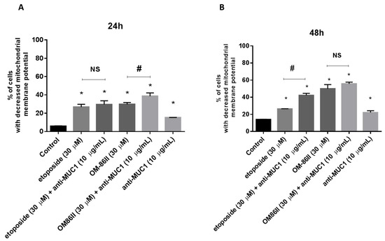 Fluorescence of AGS gastric cancer cells treated for 24 h (A) and 48 h (B) with anti-MUC1 (10 μg/mL), OM-86II (30 μM), OM-86II + anti-MUC1 (30 μM + 10 μg/mL), etoposide (30 μM) and etoposide + anti-MUC1 (30 μM + 10 μg/mL) incubated with mitochondrial membrane potential probe JC-1. X- and y-axes are green and red fluorescence, respectively. Mean percentage values from three independent experiments (n = 3), performed in duplicate, are presented. * p < 0.05 vs. control group; # p < 0.05. MUC1, mucin-1; OM-86II, octahydropyrazin[2,1-a:5,4-a′]diisoquinoline derivative; NS, not significant.