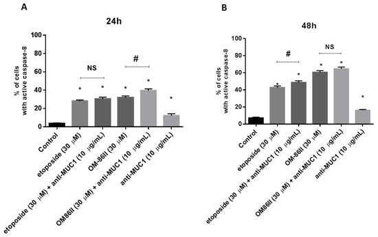 Caspase-8 activity in AGS gastric cancer cells treated for 24 h (A) and 48 h (B) with anti-MUC1 (10 μg/mL), OM-86II (30 μM), OM-86II + anti-MUC1 (30 μM + 10 μg/mL), etoposide (30 μM) and etoposide + anti-MUC1 (30 μM + 10 μg/mL) was demonstrated using flow cytometry. Mean percentage values from three independent experiments (n = 3), performed in duplicate, are presented. * p < 0.05 vs. control group; # p < 0.05. MUC1, mucin-1; OM-86II, octahydropyrazin[2,1-a:5,4-a′]diisoquinoline derivative; NS, not significant.