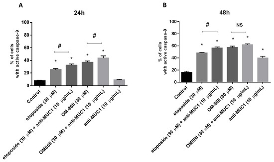 Caspase-9 activity in AGS gastric cancer cells treated for 24 h (A) and 48 h (B) with anti-MUC1 (10 μg/mL), OM-86II (30 μM), OM-86II + anti-MUC1 (30 μM + 10 μg/mL), etoposide (30 μM) and etoposide + anti-MUC1 (30 μM + 10 μg/mL) was demonstrated using flow cytometry. Mean percentage values from three independent experiments (n = 3), performed in duplicate, are presented. * p < 0.05 vs. control group; # p < 0.05. MUC1, mucin-1; OM-86II, octahydropyrazin[2,1-a:5,4-a′]diisoquinoline derivative; NS, not significant.